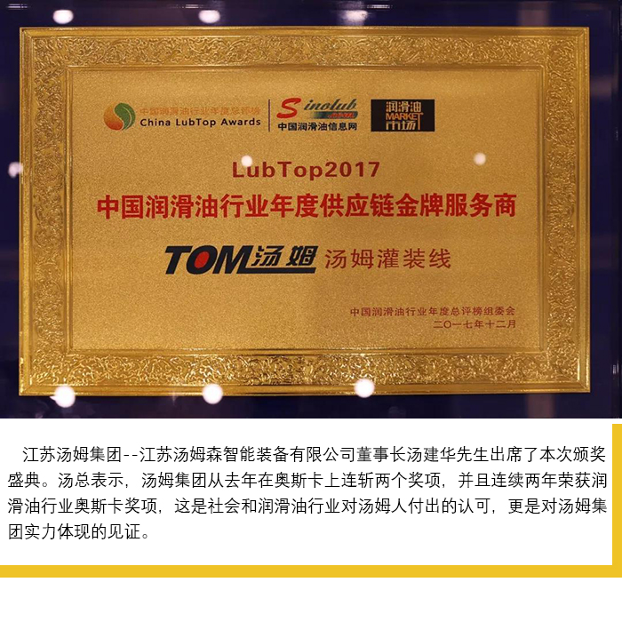 【喜訊】湯姆再次榮獲 LubTop2017中國潤滑油行業年度供應鏈金牌服務商獎!
